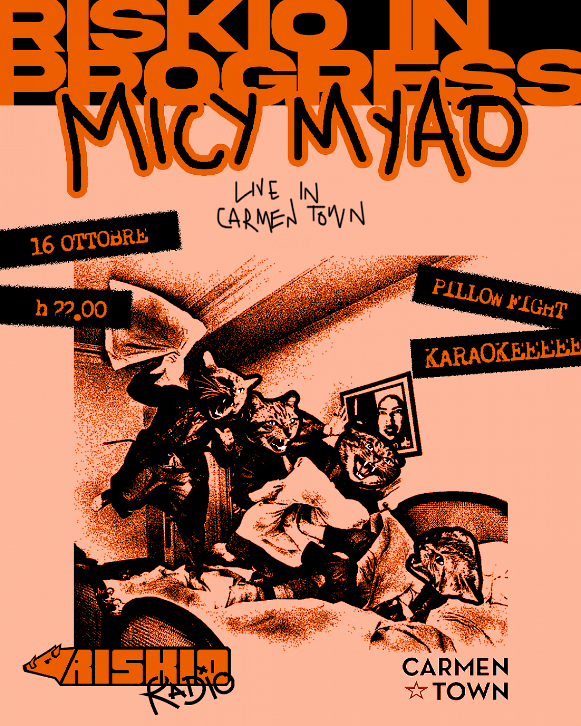 Hai mai sognato di andare in pigiama in cantiere? Nemmeno io, però con Riskio Radio, puoi farlo! Giovedi 16 ottobre dalle 22.00 al Carmen Town iniziamo i lavori con un live dei Micy Myao accompagnato da una lotta di cuscini sotto cassa e dalle 23 in poi si prosegue con aux set e karaoke a tema “white girl music”. Ci vediamo giovedì prossimo!