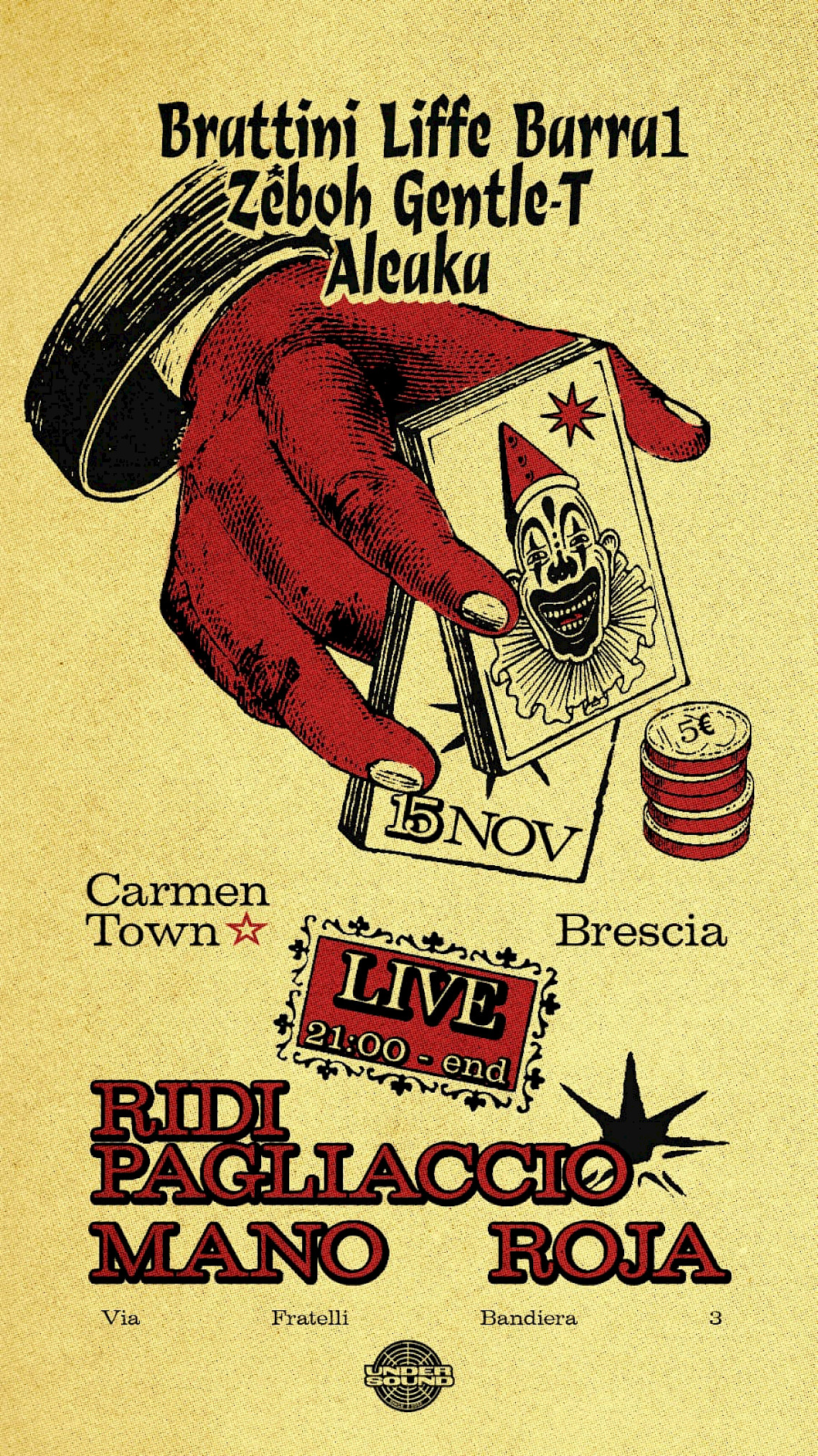 Sabato 15 Novembre, UnderSound presenta RIDI PAGLIACCIO + MANO ROJA LIVE